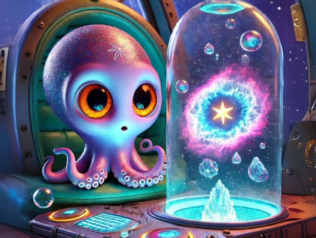 I’m Detective Octavia — the eight-armed investigator extraordinaire from the Interstellar Science Station! With shimmering blue skin that changes into dazzling nebula patterns and golden amber eyes that spot the tiniest clues, I solve the universe’s greatest mysteries one tentacle at a time.