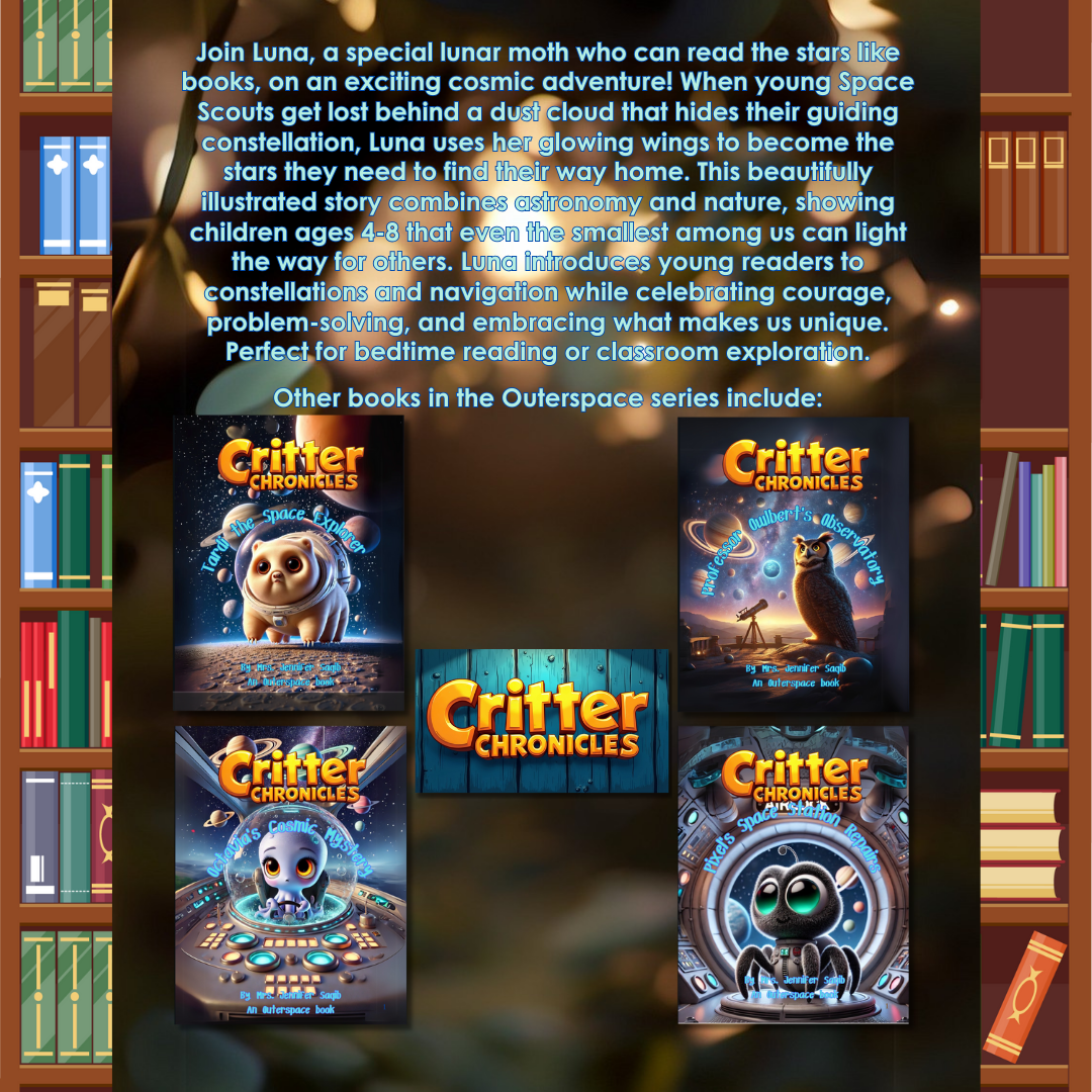 Join Luna, a glowing lunar moth with a gift for reading the stars, on a cosmic rescue mission! When young Space Scouts get lost in a cosmic dust cloud, Luna uses her shimmering wings to recreate the constellation Ursa Major and guide them home. Perfect for ages 4–8, this beautifully illustrated story blends astronomy, nature, and problem-solving while celebrating courage and individuality. Softcover 31 pages